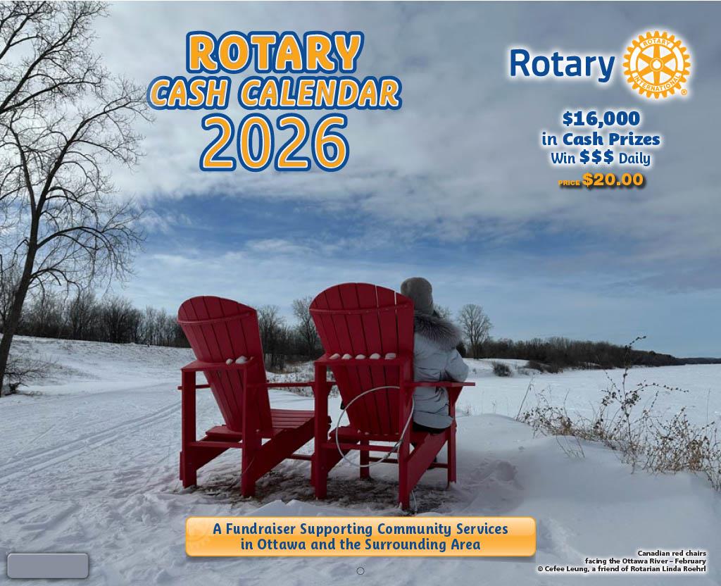 This year’s calendar features stunning local photography by Rotary members and friends — and doubles as a lottery ticket for a full year of daily cash draws. $20 per calendar. Joan Hunter will have calendars available at our in-person meetings. Pick your calendars up from Joan as soon as possible. Please pay Joan by cash or by e-transfer: service@rotaryottawasouth.ca. Remember to state in the email the money is for calendars. Thank you. (Our club receives $10 for every calendar sold).